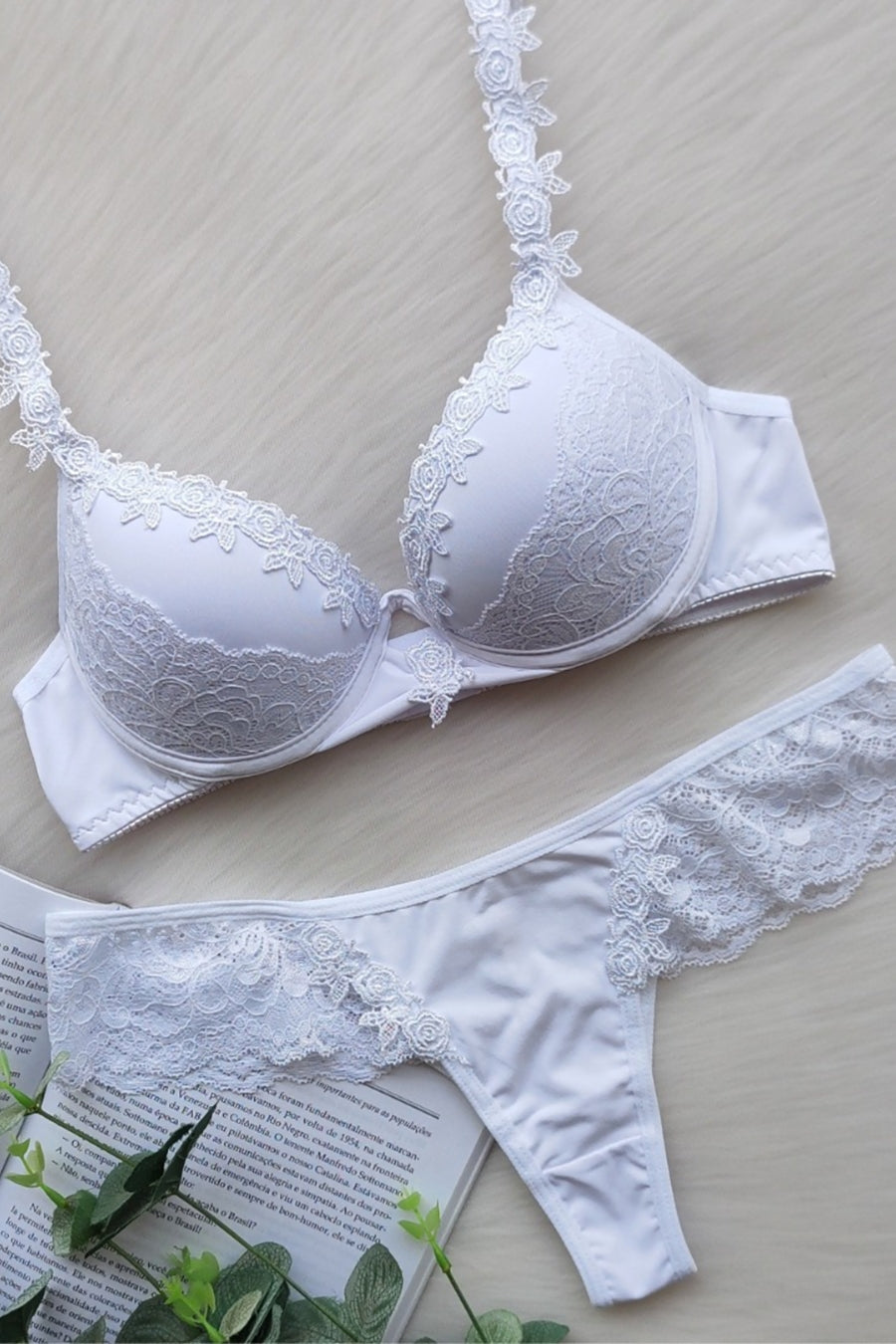O sutiã traz renda delicada e guipure no bojo e nas alças, enquanto a calcinha fio completa o visual com caimento perfeito e forro em algodão.