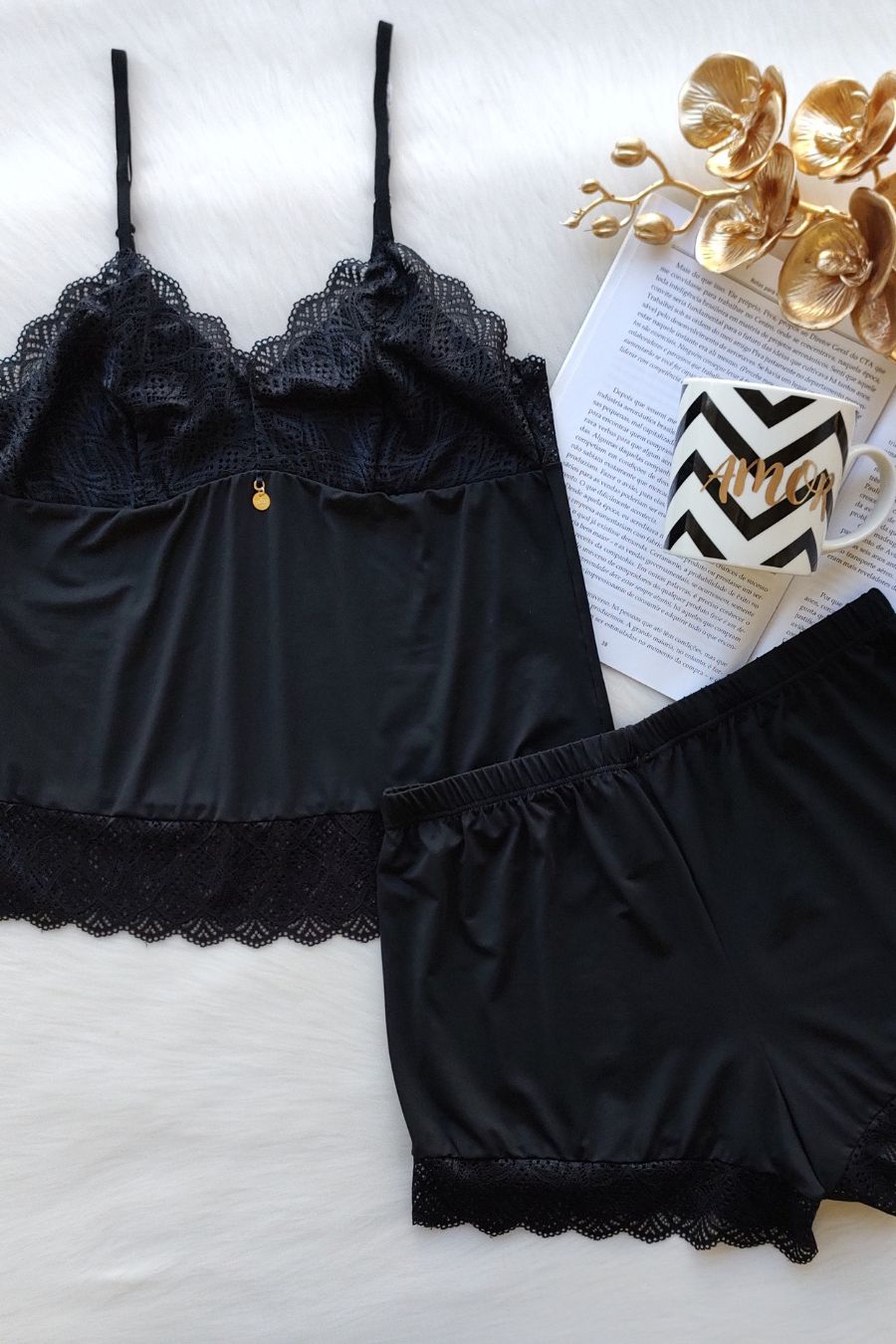Wrap yourself in effortless sophistication with this soft microfiber set, finished with delicate lace and a hint of sparkle. The adjustable top features a semi-jewel accent and lace-trimmed neckline, while the matching shorts offer comfort and charm in every detail. A graceful choice for your most intimate moments.