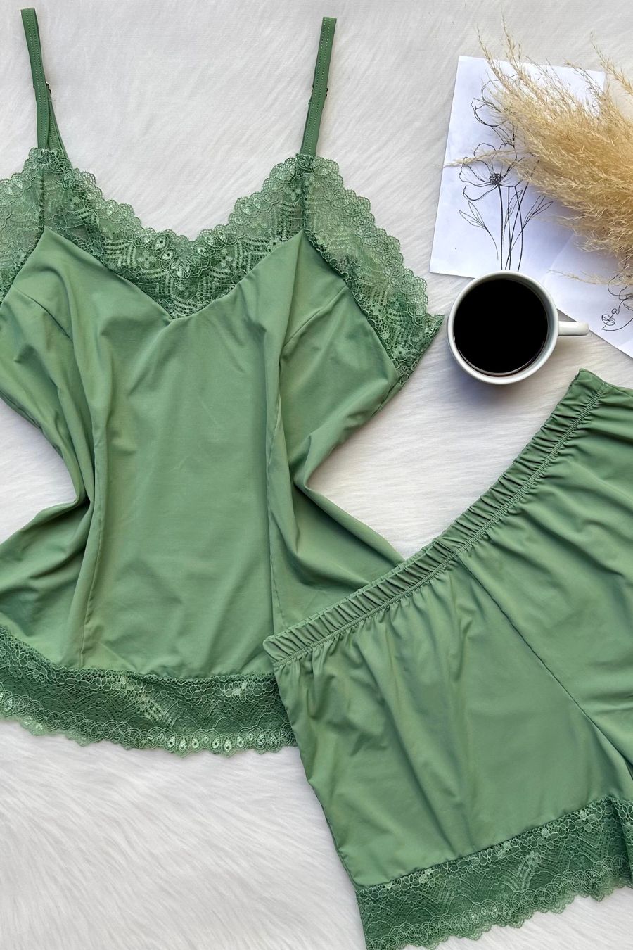 The soft, flowing top features delicate lace accents that subtly frame the silhouette, offering a whisper of romance. Paired with a relaxed-fit short, this set is effortlessly elegant and made for ease — whether you're winding down or starting a slow morning.